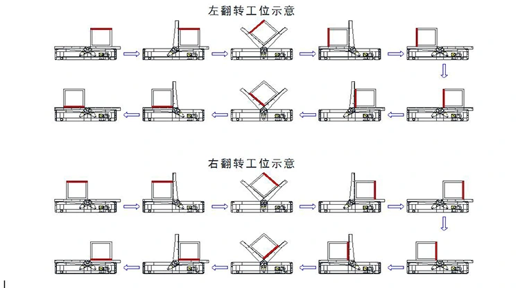 Pro převzetí pracovních kusů přivařených na jedné straně se používají dva kusy mobilních 180 ° ploutve s hydraulickým paprskem. When working, lift the work piece away from the roller table or work-piece rack, and the reducer drives the two beam flippers to move synchronously to move the work piece to the side of the roller table or work-piece rack, and then two hydraulic cylinders drive the two arms to rotate synchronously, move the work piece to the middle of the roller table or work-piece rack after overturning, and then transport the work piece to the next process or welding.
